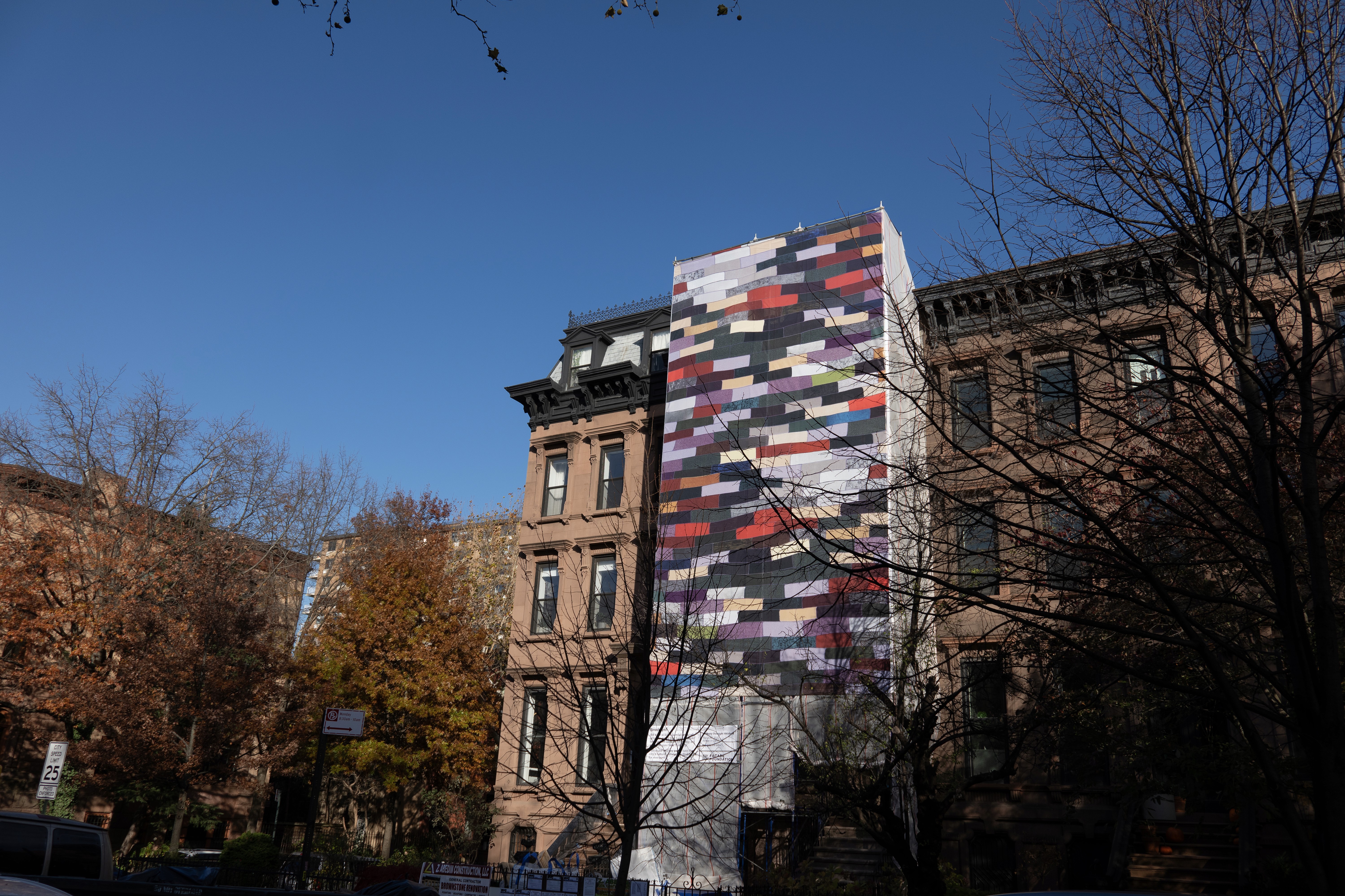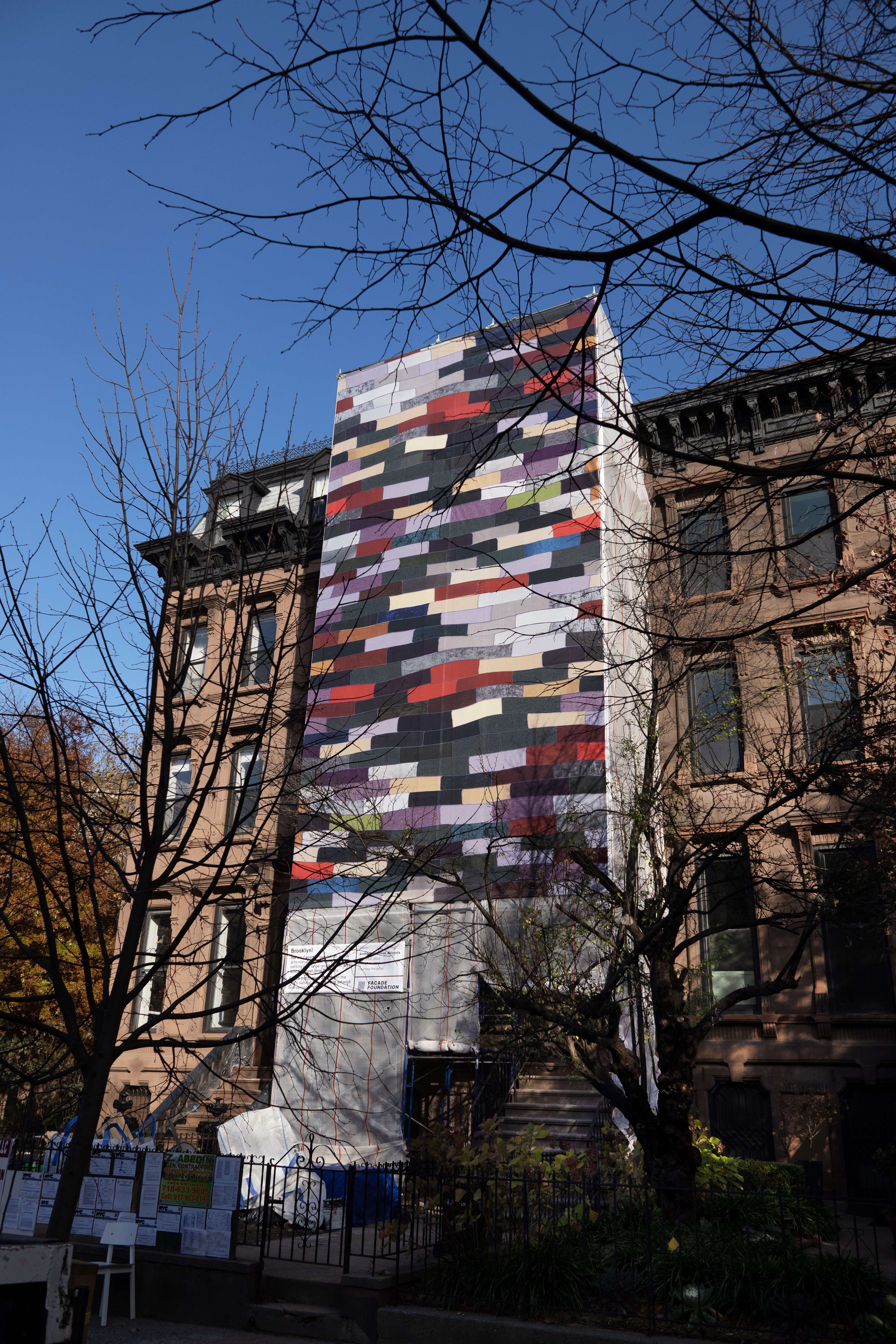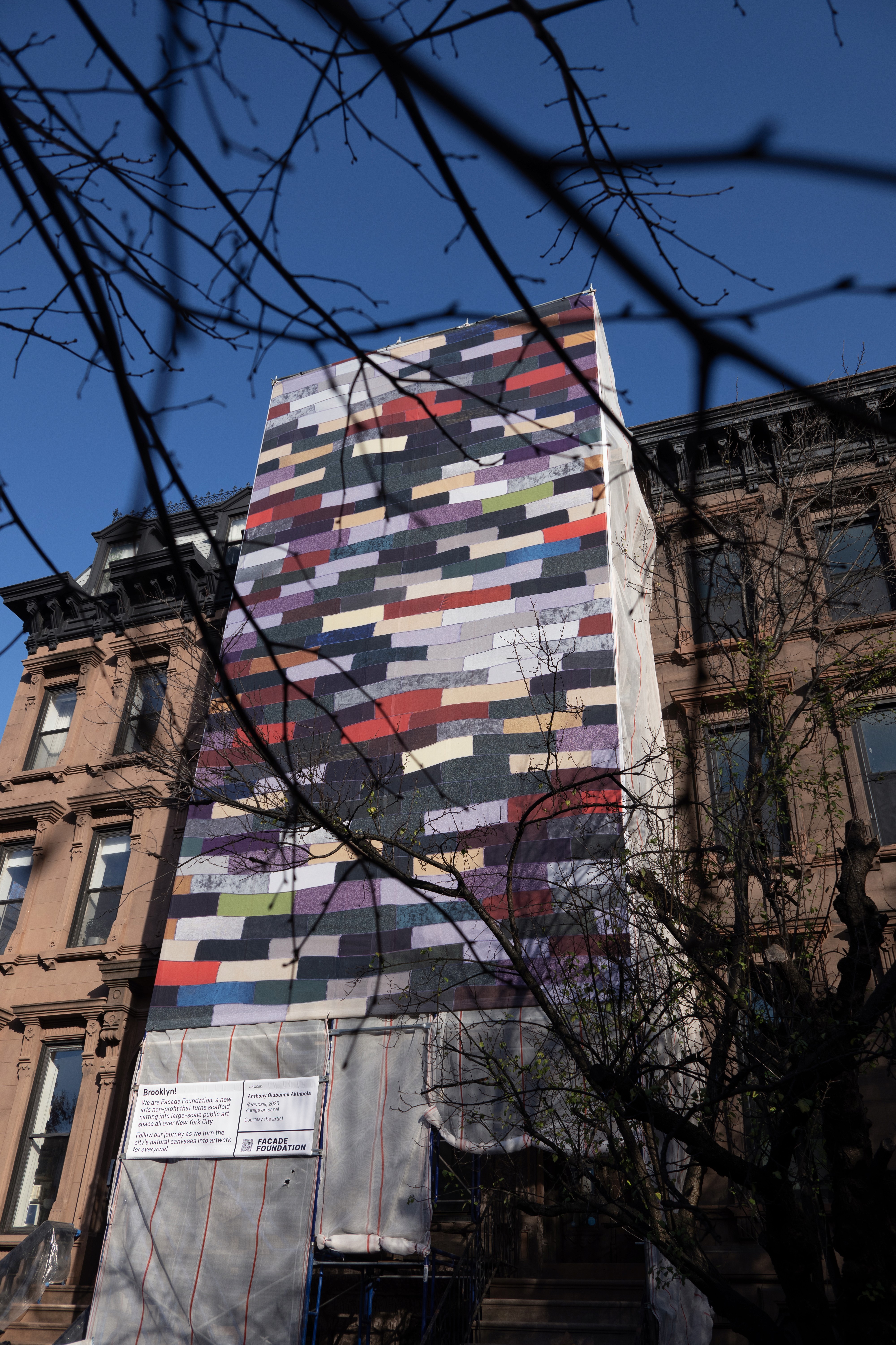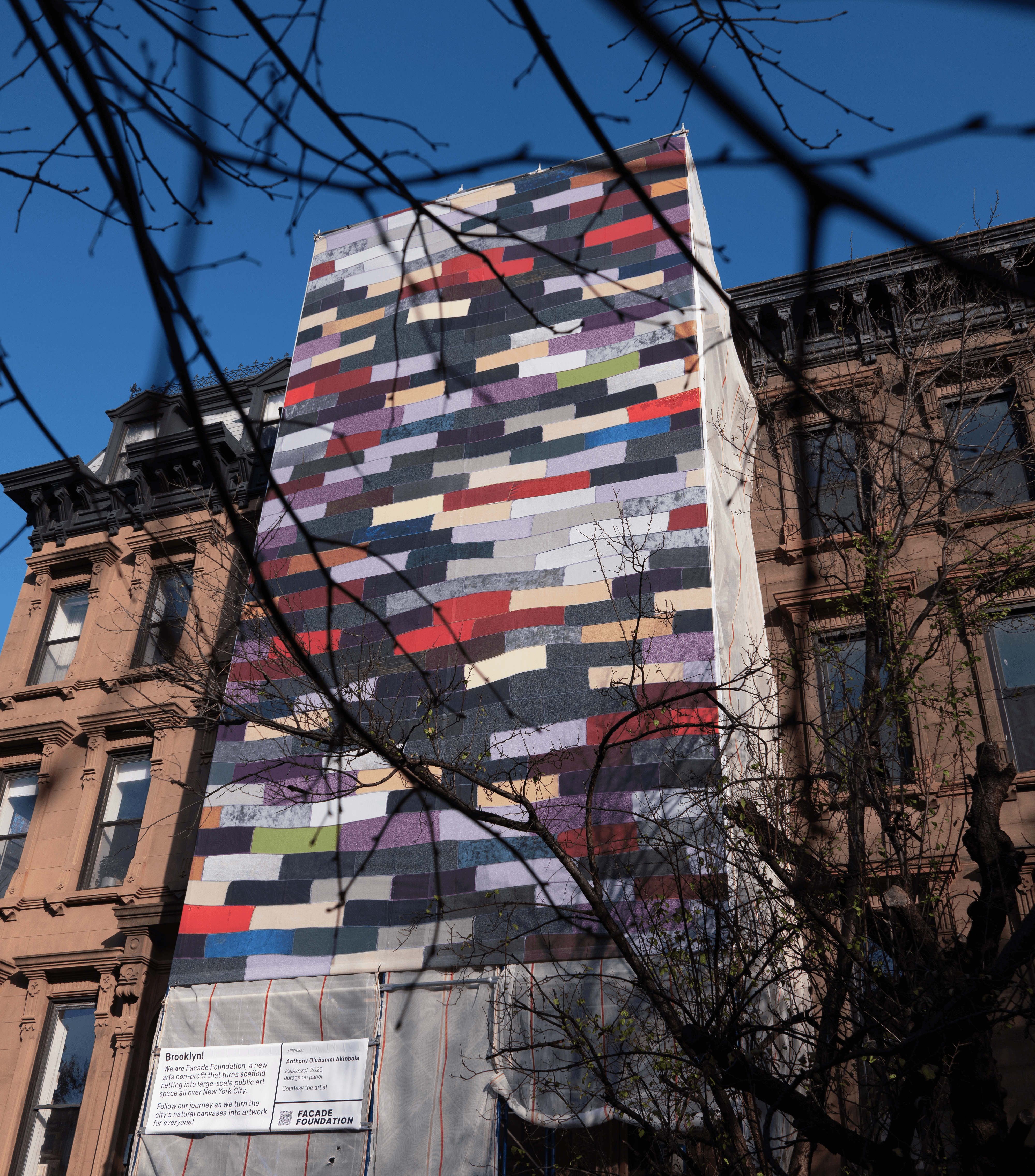 Located at the corner of Washington Ave & Willoughby St in Brooklyn through January 2026, Facade Foundation is proud to present "Rapunzel," the first public presentation of Anthony Olubunmi Akinbola's work to date. Fittingly, Anthony's work has long centered on reconsidering everyday objects ad the cultural weight they can carry. Born to immigrant parents and raised between Nigeria and the United State, he often turns to materials that hold particular resonance in Black American life - palm oil, hair brushes, and especially durags. For Rapunzel, he scales this language up, translating a durag-based work onto vinyl scaffold netting, extending its presence into the public realm at an architectural scale.